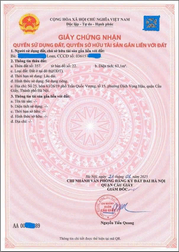 - Sổ đỏ chính chủ, sổ đẹp mẫu mới 2025, mã QR, địa chỉ chuẩn, (xem ảnh), giao dịch sang tên trong ngày.